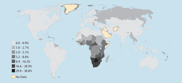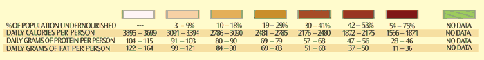 Harvard School of Health - adults need a minimum of 1 gram of protein / kilogram of body weight; an adult weighing 68 kilos (150 lbs) needs a minimum of 68 grams of protein / day. 6 oz. of fish = 41.2 grams of protein, 1 cup of milk = 8 grams protein. "Over 852 million people throughout the world do not have enough food to meet their basic nutritional needs." c "as many as a third of the world's people do not meet their physical and intellectual potential because of vitamin and mineral deficiencies." c "Armed conflicts are now the leading cause of world hunger with HIV/AIDS and climate change not far behind." d Percentage of Children Under the Age of Five Suffering From StuntingStunting does not come easy - it takes time. It means a child has endured painful illness, hunger, inadequate care. Many do not survive. Many who do have deficits in mental capacity along with losses in stature. Typically, its effects become permanent. ![]() Stunting also occurs because the mother was poorly nourished or because she herself was stunted. This vicious cycle is a result of poverty, a lack of clean water supply...or a long distance between home and health clinic. In the developing world, 39% of children under five are stunted — around 209 million children. Human Development Index (HDI) and Recent Colonial ControlNorway's HDI rank is 1; Canada- 4; United States- 8; Japan- 9; Chile- 43; China- 94; Sierra Leone- 177. ![]() The "HDI" ranks the relative "development" of the world's countries based on three indicators: longevity, as measured by life expectancy at birth; educational attainment, measured by a combination of adult literacy rate (two thirds weight) and combined gross primary, secondary and tertiary enrolment in schools (one third weight); and standard of living, as measured by GDP per capita - PPP (purchasing power parity) US$. "20,000 species are used in traditional medicine, which forms the basis of primary health care for about 80% of the 3 billion people in developing countries" 1 Indigenous Language / Cultural Extinctions60 - 70% of the world's 6,000 languages are endangered and have no children speakers.1 Up to 95% may be extinct within 100 years.2 the extinction rate of languages, and often the people who speak them, is astounding. language and cultural diversity is often matched by regional biodiversity - suggesting that both language and nature are a single system of diversity. "first world" societies are replacing ancient linguistic cultural diversity with vast "mono-languages." 0.2% of all existing languages are spoken by over 50% of humanity, inhabiting upwards of 85% of the land surface of the globe. these same languages are of the cultures primarily responsible for the global extinction crisis.3 AIDSPercentage of population aged 15 - 49 living wth HIV (does not include 2.2 million children under 15 living with HIV) ![]() "In sub-Saharan Africa an estimated 25 million people are infected with HIV — almost 2/3 of all people living with HIV. [In 2004] 2.2 million died (75% of the 3 million deaths globally)." - UNAIDS "The number of people living with HIV in East Asia rose by almost 50% between 2002 and 2004, an increase that is attributable largely to China's swiftly growing epidemic." - UNAIDS